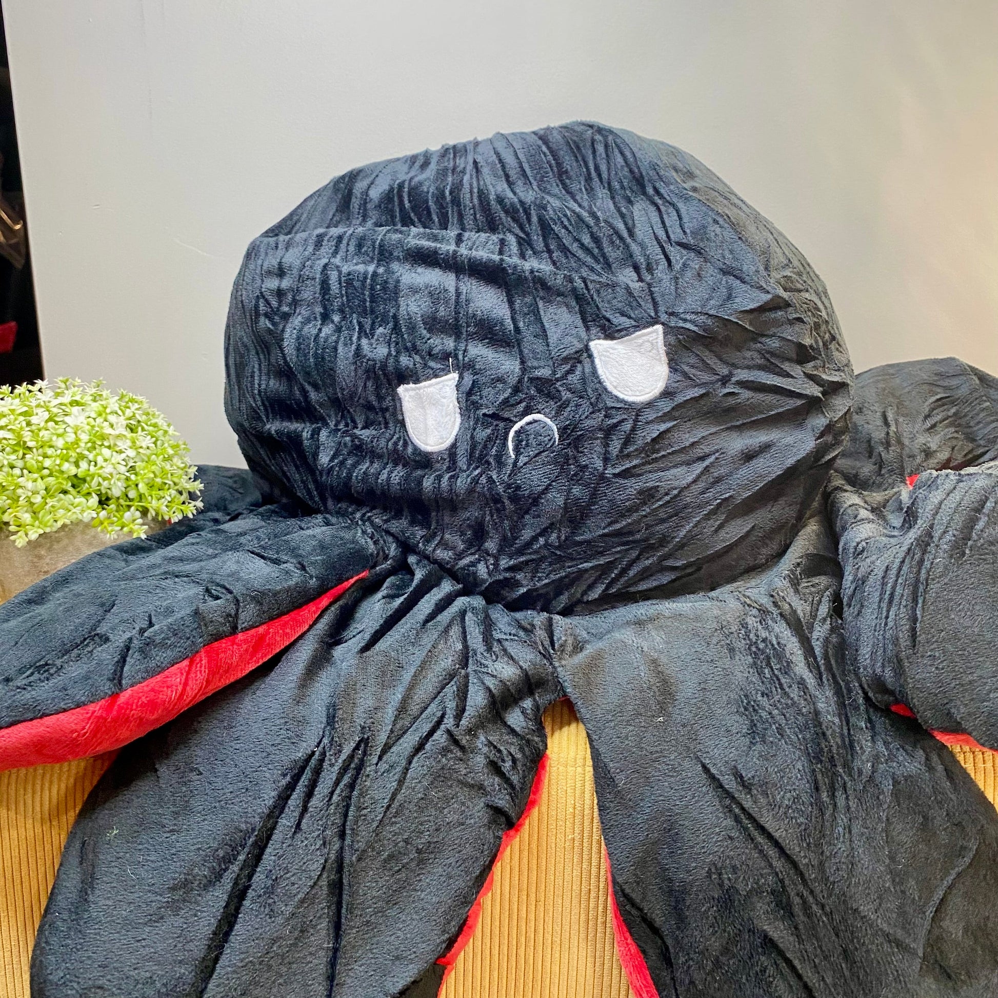 Reversible octopus plush. One side happy, one side mad or as shown otherwise! So moody!